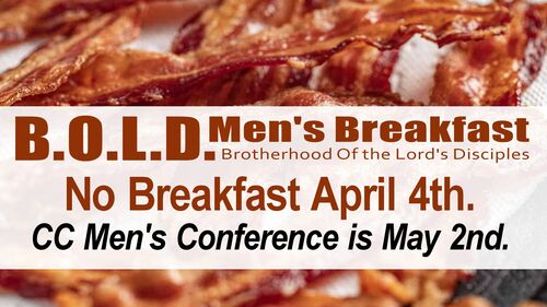 Brotherhood of the Lord's Disciples (B.O.L.D.) Men's Discipleship Breakfast is first Saturday of the month at 8AM in the CCBC Fellowship Hall. All men (high school aged & up) are invited to this time of great food, fellowship, and Biblical encouragement. No childcare available.