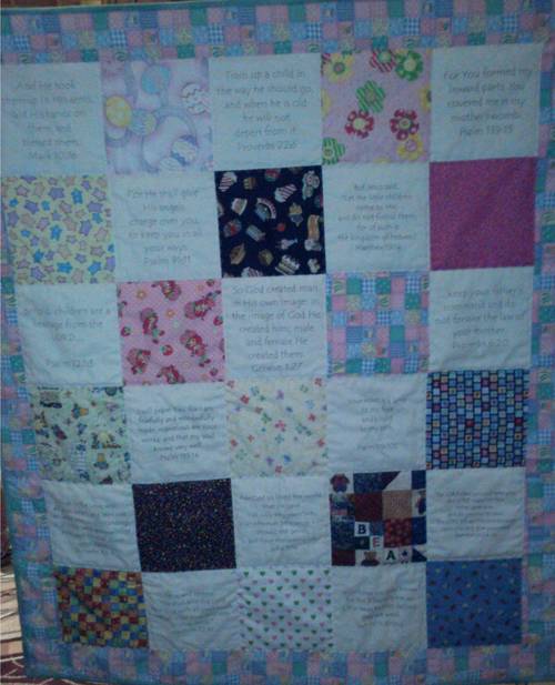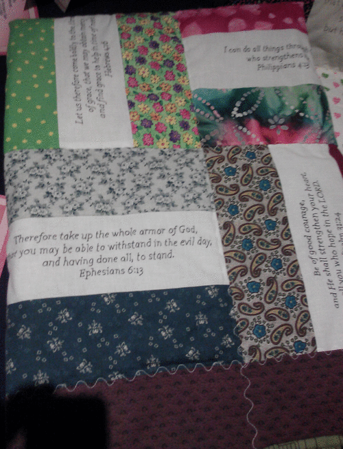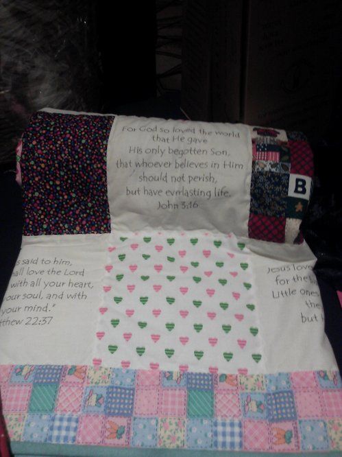 Through love and prayer, the women of this ministry make beautiful quilts that have the truth and encouragement found in God’s Word written right on them! They are a thoughtful and powerful gift to give to someone who is sick or in the hospital, someone who has just suffered the loss of a loved one, or experienced the joy of the birth of a new baby, just to name a few examples.